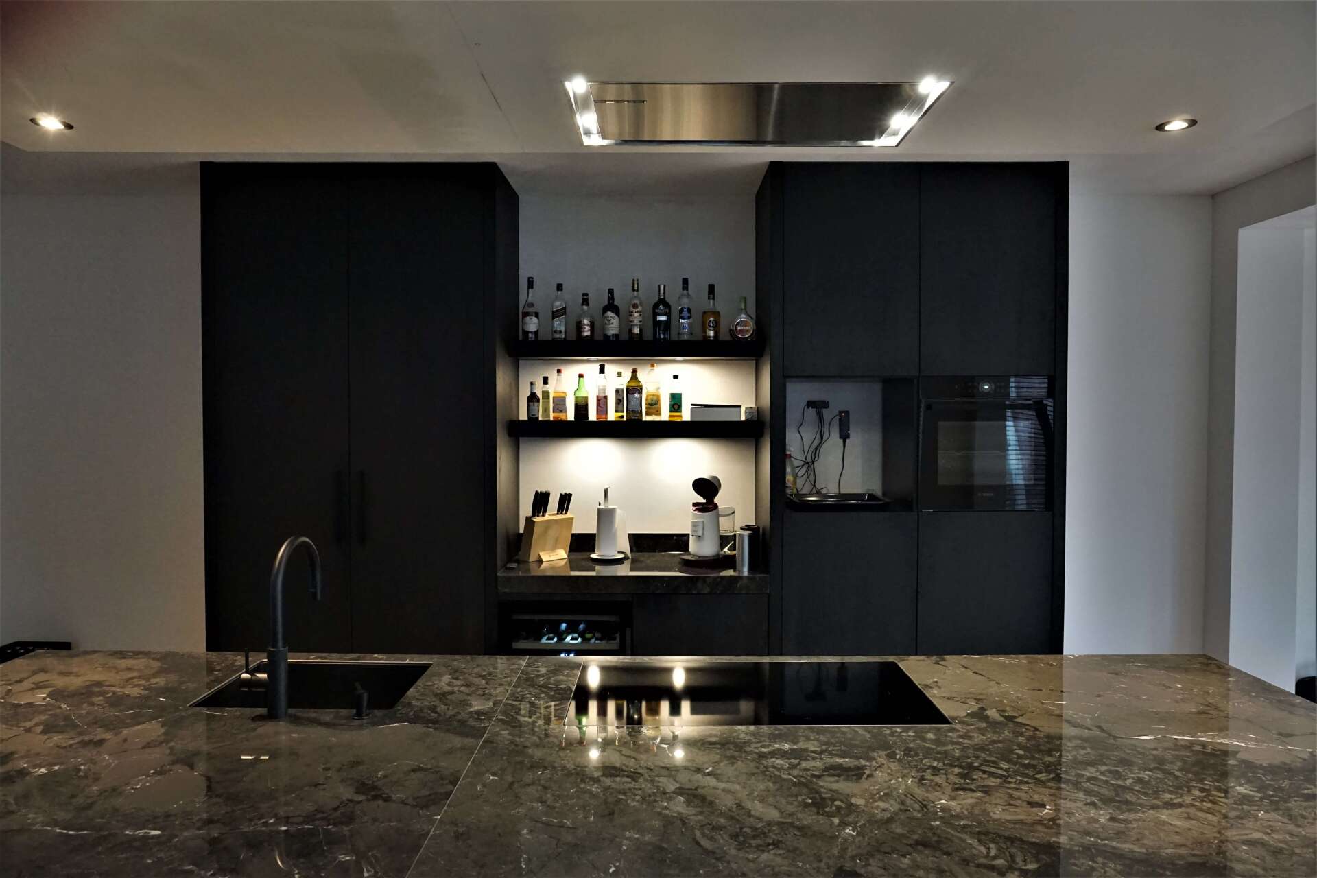 Familie Loeffen toverde een oud schoenenzaak om tot een compleet nieuwe woonruimte. Wij mochten hier ons steentje aan bijdragen door een complete matzwarte maatwerk keuken te ontwerpen en realiseren. De keuken bestaat uit een apparatenwand, kookeiland en plafondkoof en is onder andere voorzien van een koelkast, vriezer, oven, combi magnetron, inductiekookplaat, vaatwasser, Quooker kroon, wijnkoelkast en besteklades.