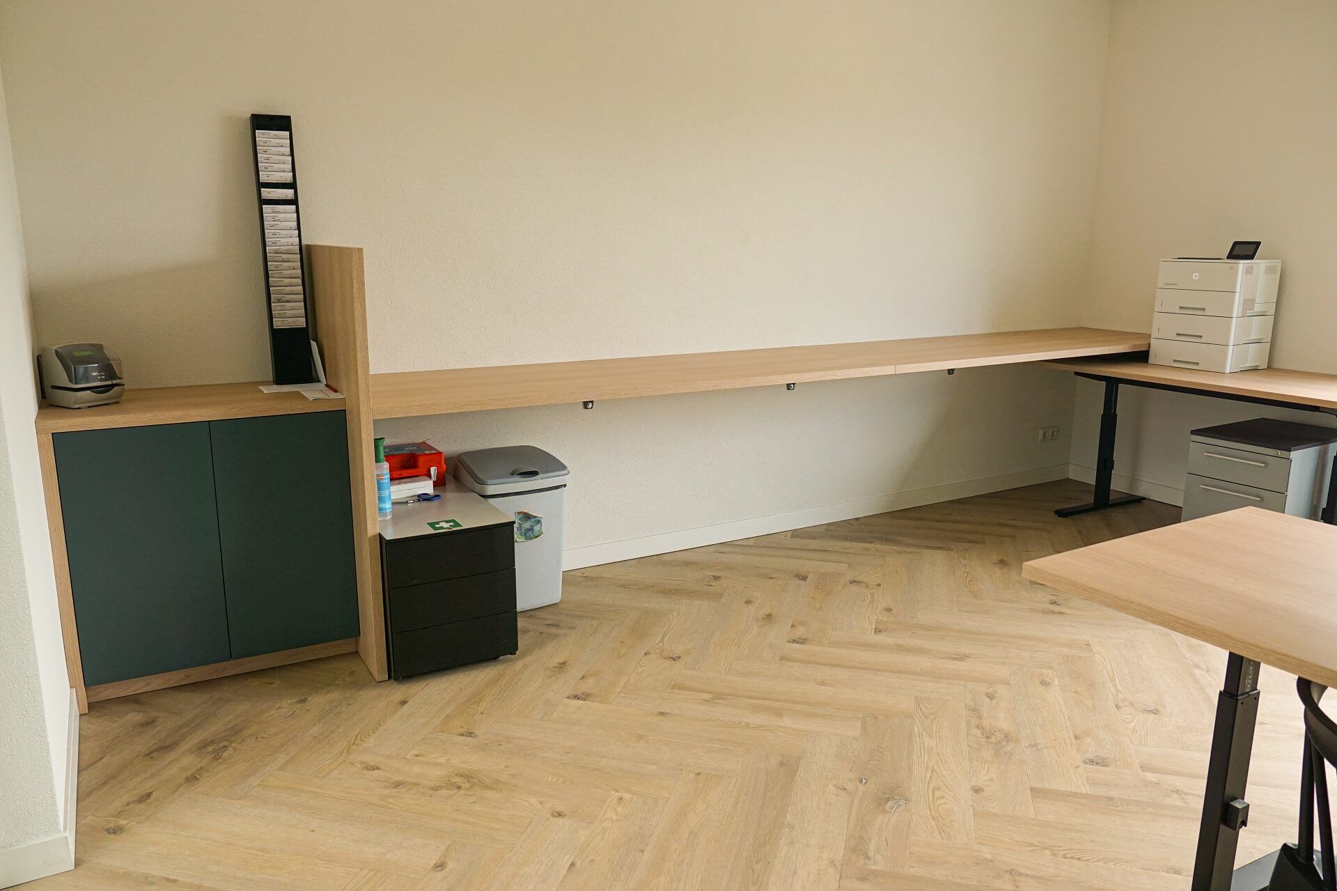 Specifiek hebben wij een nieuwe kastenwand van bijna 6 meter, diverse houten kolommen door het gehele kantoorpand, een nieuwe ronde vergadertafel én een hoge tafel ontworpen en gerealiseerd.