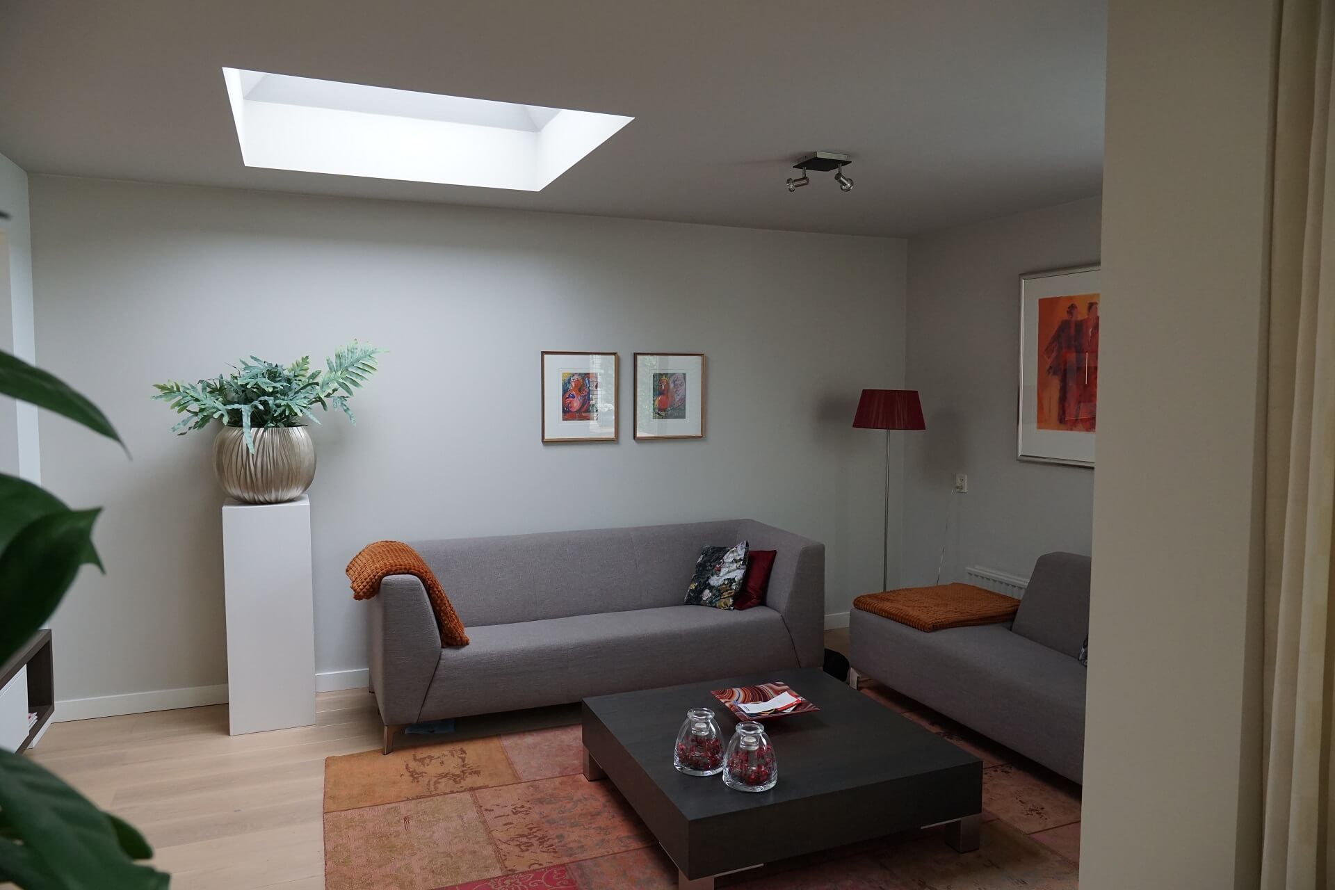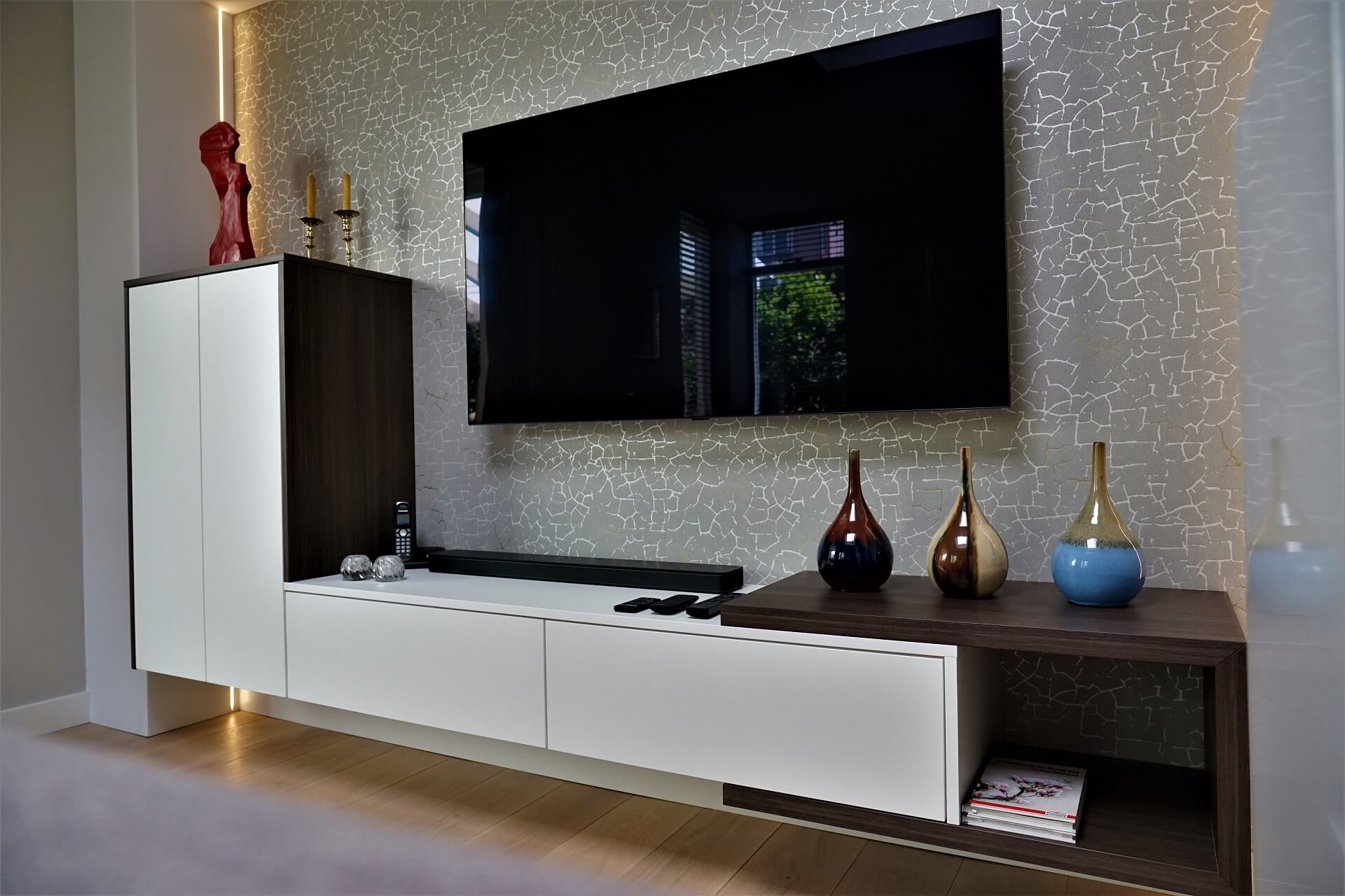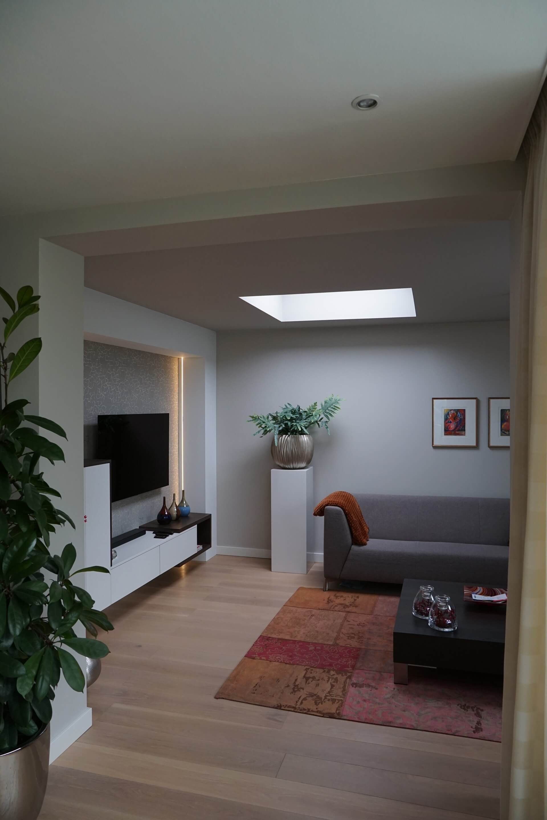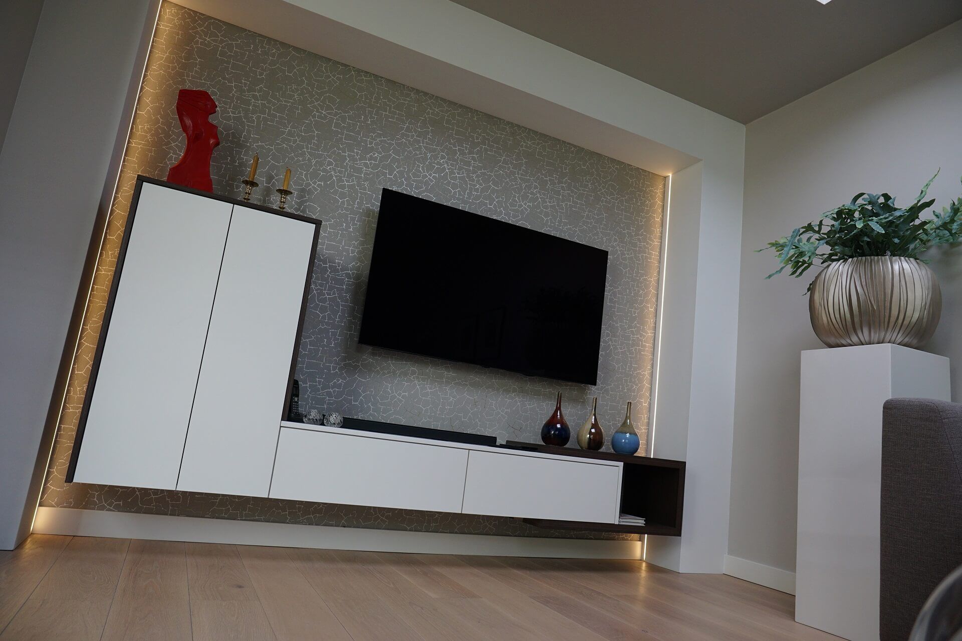 Na oplevering van de bouwgerelateerde werkzaamheden hebben we als kers op de taart ook nog een exclusief zwevend TV-meubel mogen ontwerpen en realiseren. Het TV-meubel is voorzien van warm witte LED profielen die eenvoudig met een afstandsbediening te bedienen zijn.