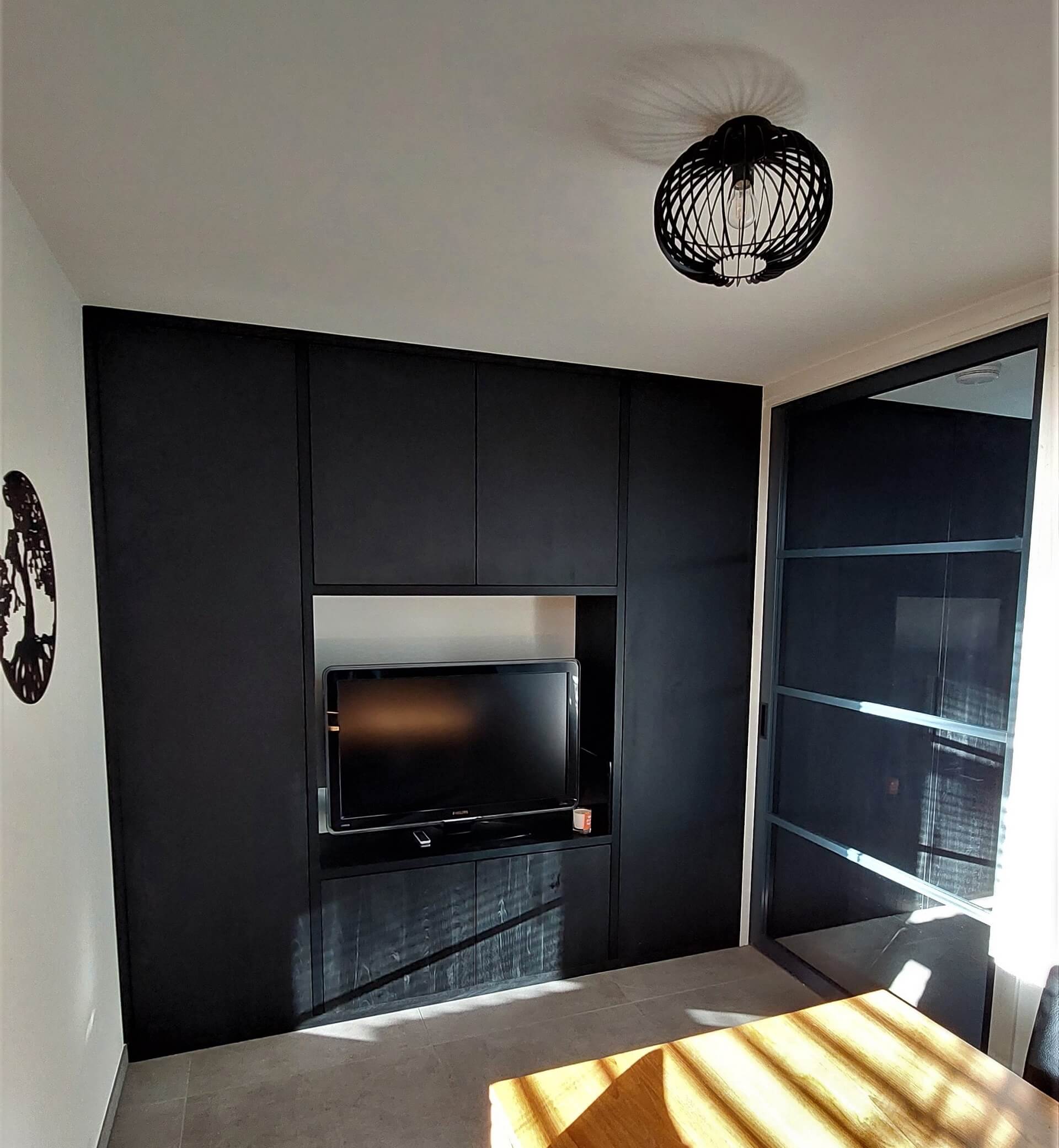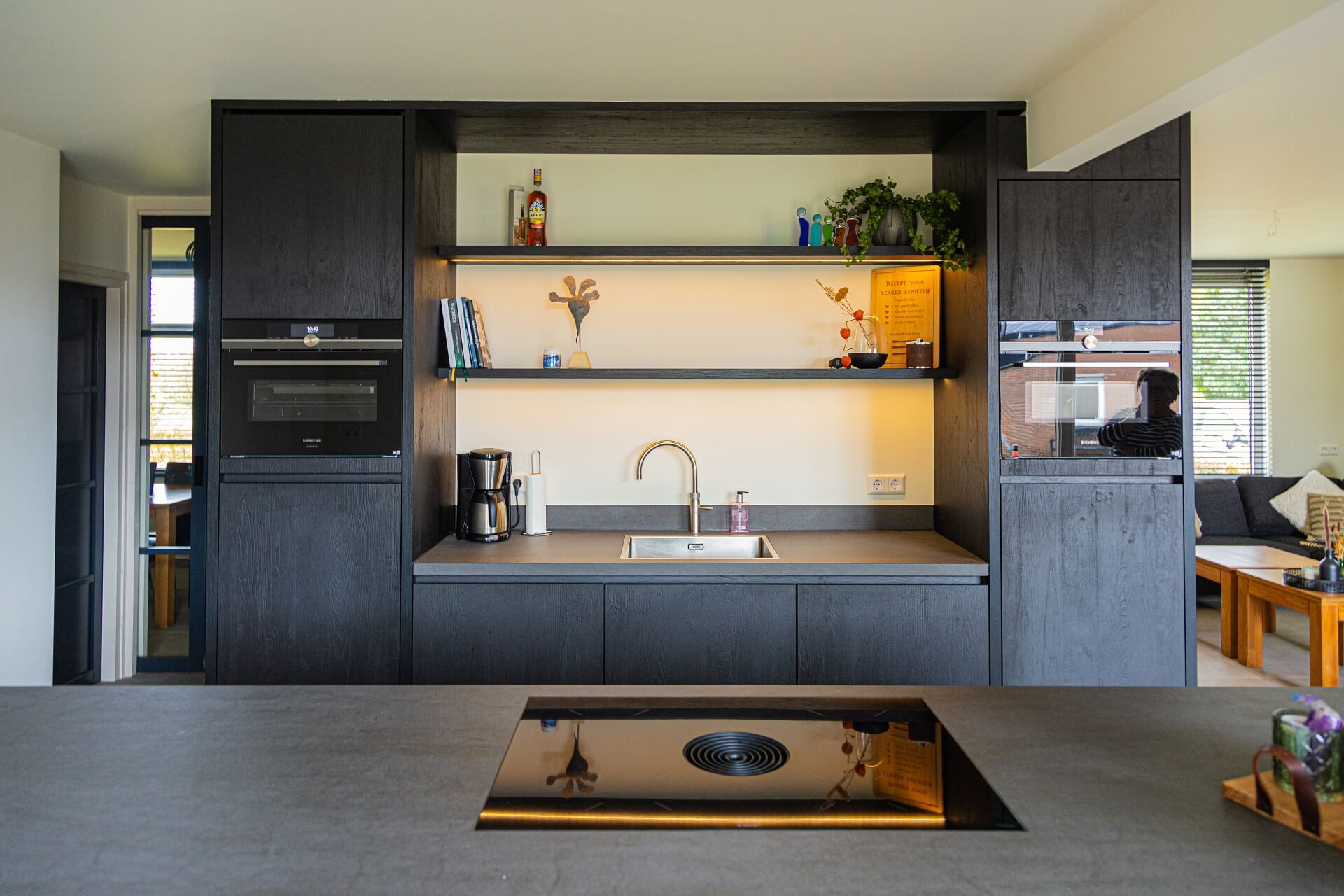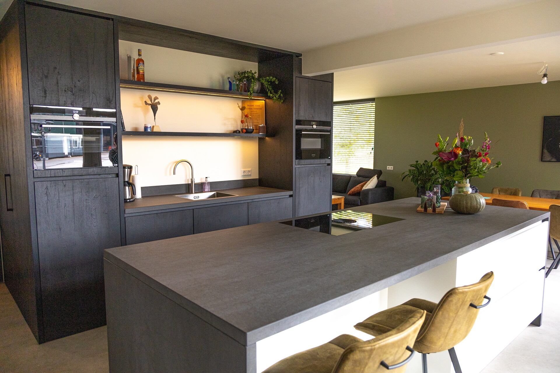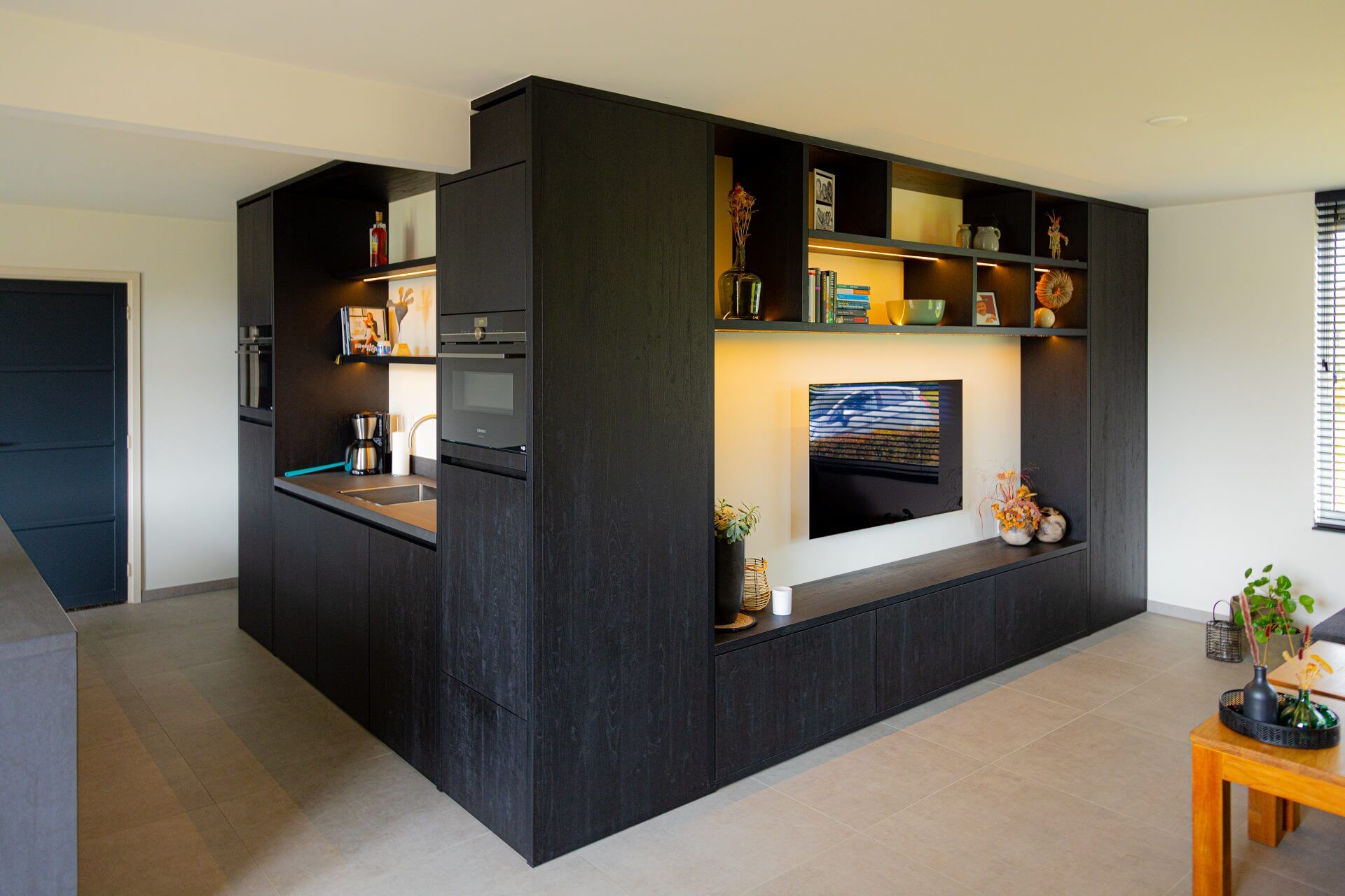 De keuken loopt door tot de woonkamer én kantoorruimte, waardoor familie Litjens niet alleen een nieuwe luxe keuken heeft, maar ook twee geïntegreerde (TV-)meubelkasten.