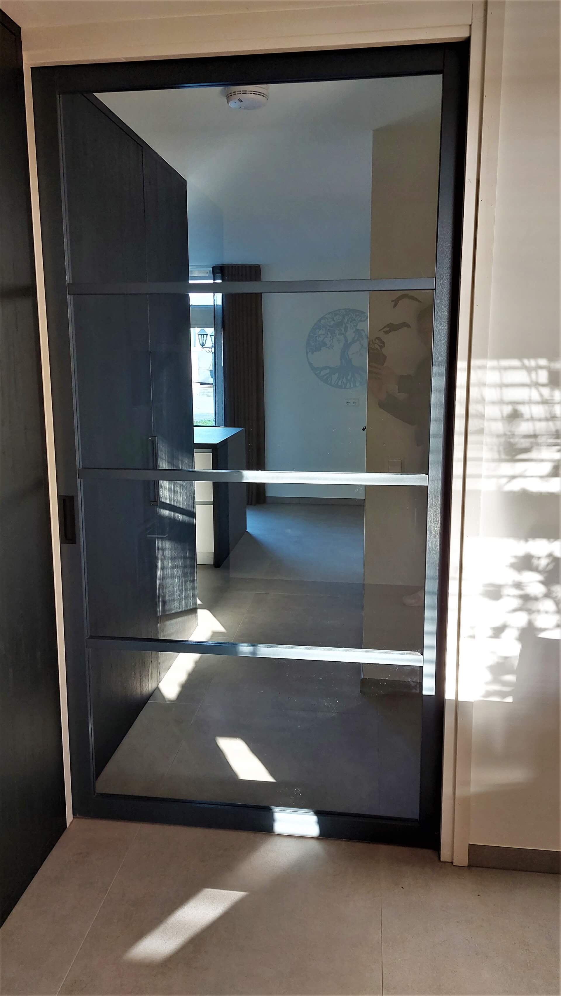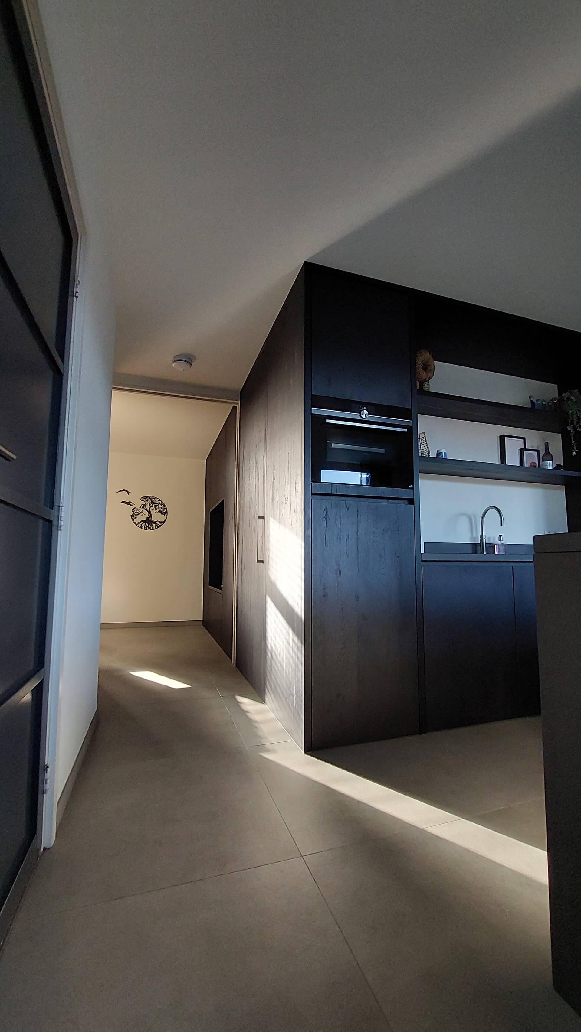 Daarnaast heeft de doorloopkeuken aan de linkerzijde een deur met een zwarte greep. Deze deur biedt doorgang naar de gang en voordeur van het woonhuis.