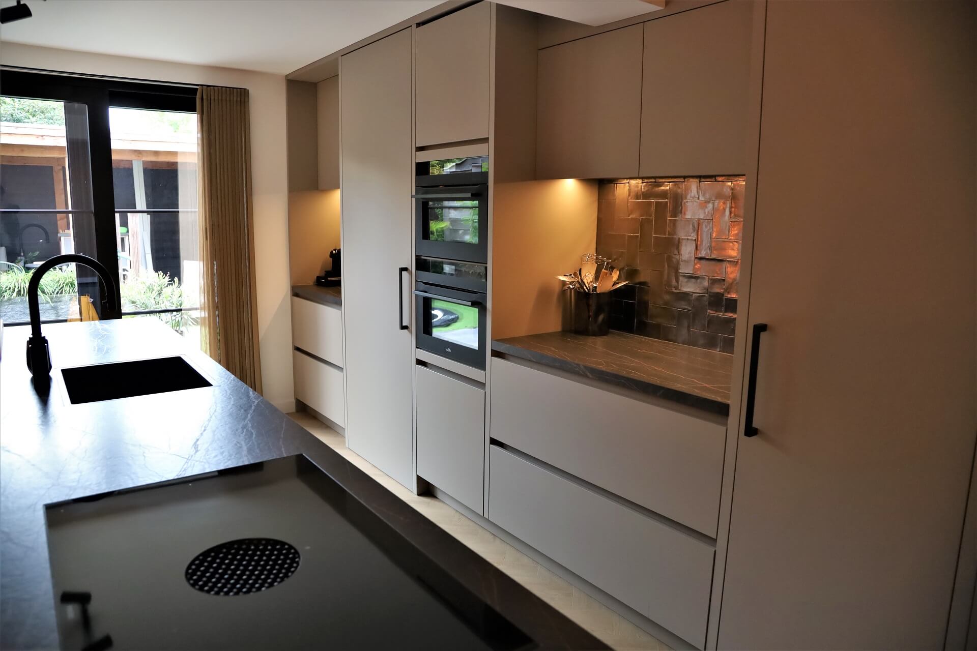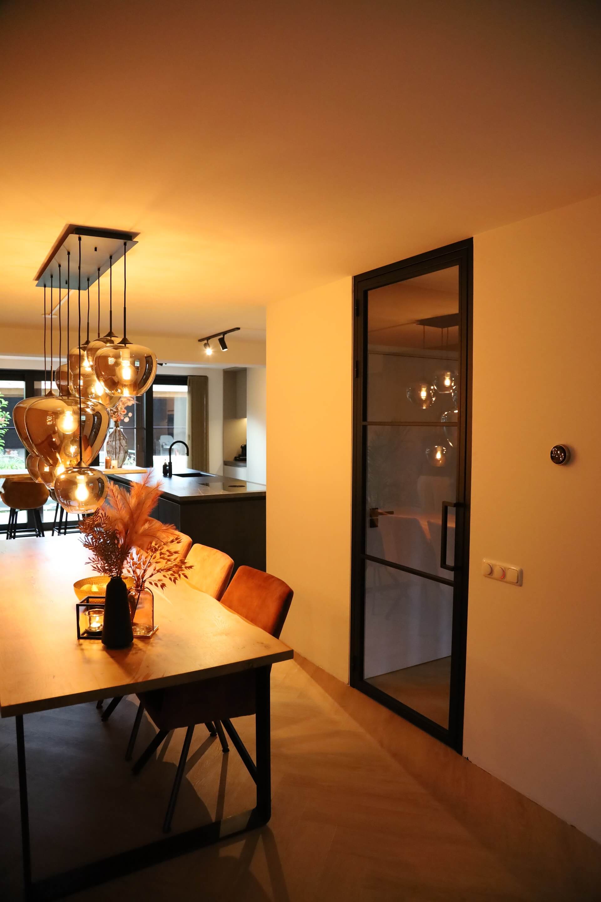 Voor familie Van Der Maden hebben wij de onderverdieping mogen voorzien van nieuw interieur. Specifiek hebben wij een luxe maatwerk keuken met twee doorloopdeuren naar garage en kantoor, een stalen deur en eettafel mogen ontwerpen en realiseren.